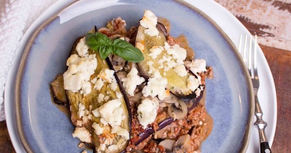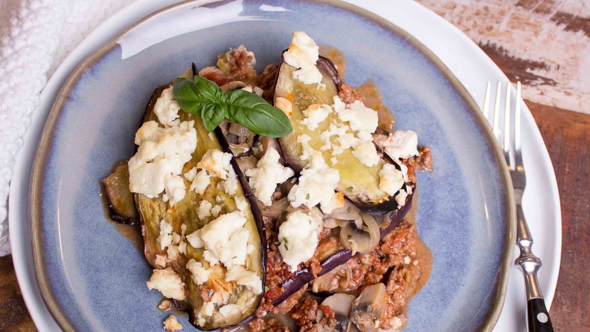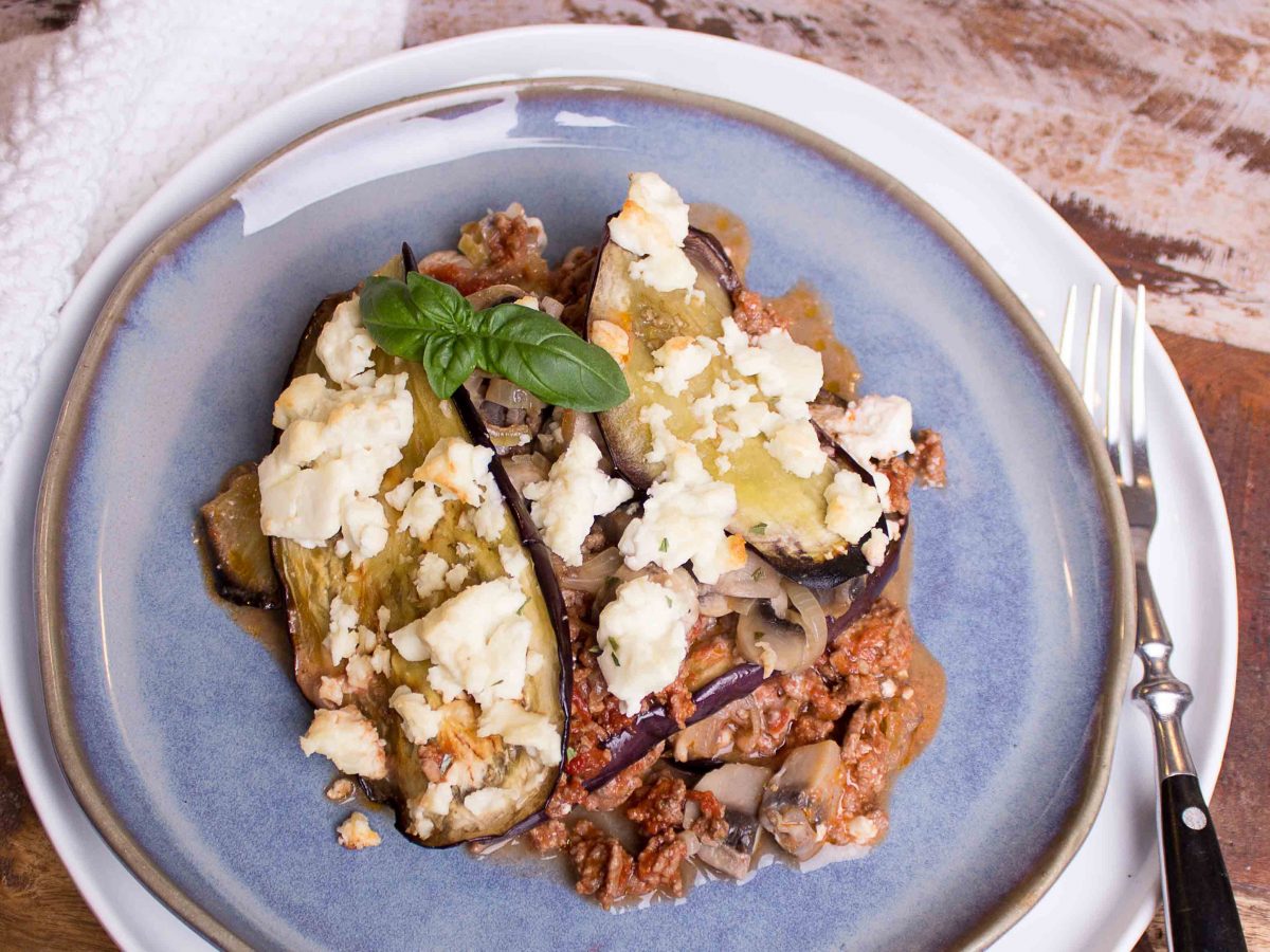 - Gut 1/3 der Auberginenscheiben in eine Auflaufform schichten, salzen. Darauf die Hälfte Hackfleischsoße geben und anschließend die Hälfte helle Pilzsoße darauf verteilen. Erneut eine Lage Auberginenscheiben auflegen, salzen und die übrigen Soßen wie zuvor darüber schichten. Mit einer Lage Aubergine abschließen. Feta zerbröckeln und über dem Auflauf verteilen.