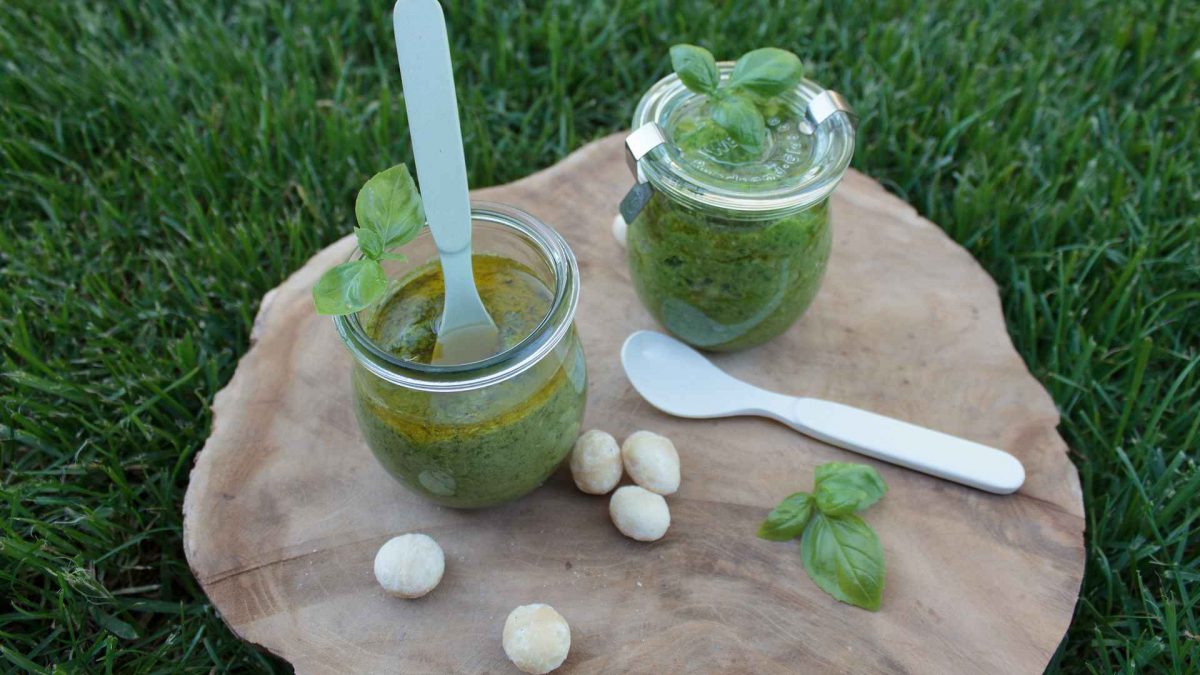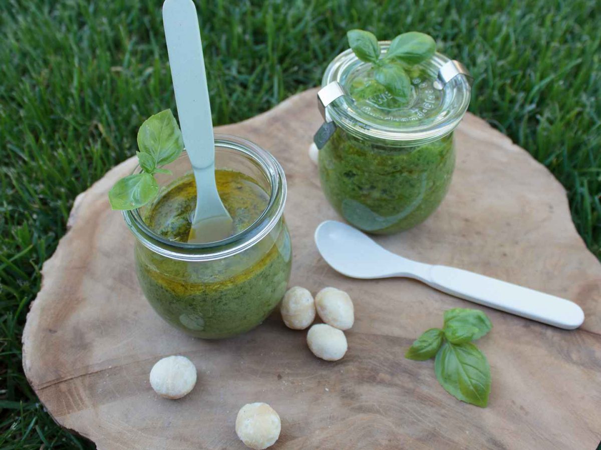 - Für beide Varianten: Mixen, bis sich eine homogene Masse ergibt. Mit Salz abschmecken und in kleine Gläser füllen. Mit Olivenöl auffüllen, bis das Pesto mit Olivenöl bedeckt ist. Das dient der besseren Haltbarkeit, auf diese Weise ist dein Pesto einige Tage im Kühlschrank haltbar. Dazu das Glas noch verschließen – fertig!