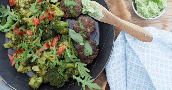 Brokkolipfanne Low Carb mit Frikadelle und Kräuterbutter
