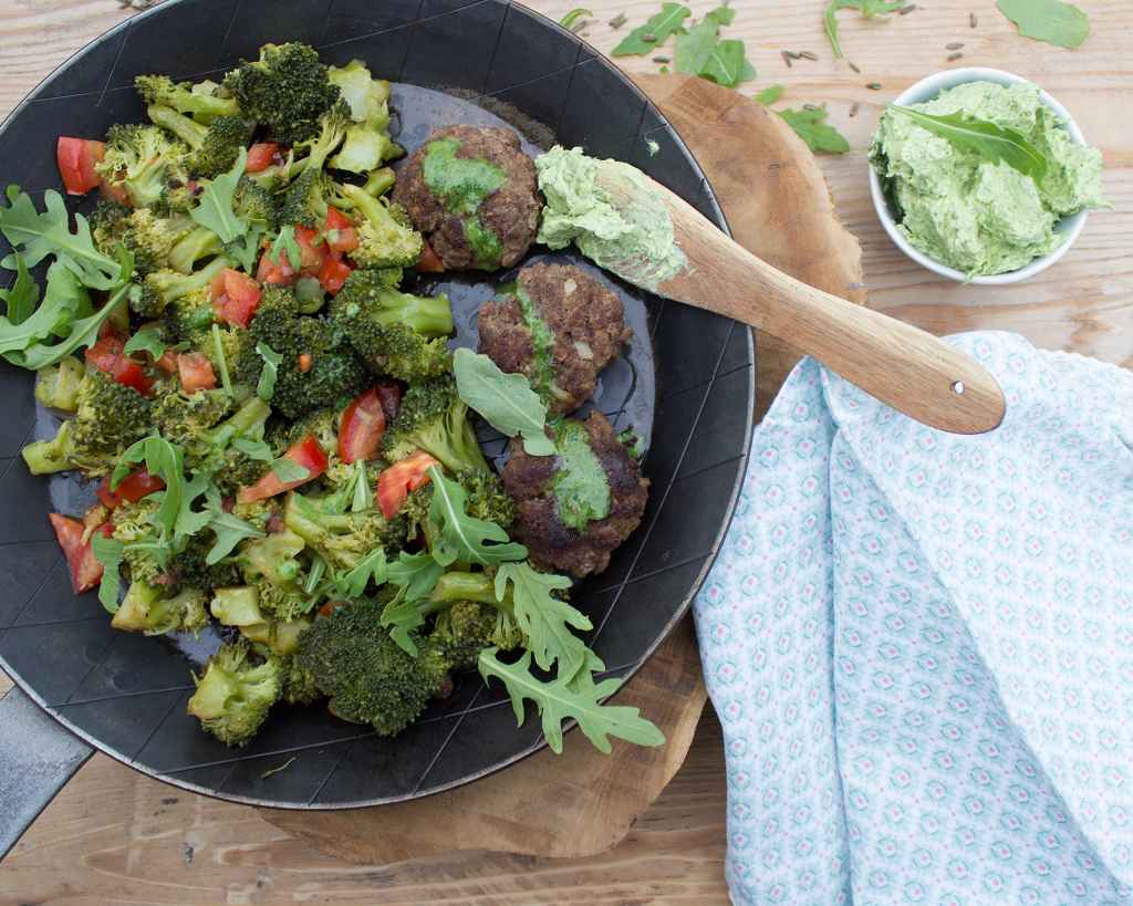 Brokkolipfanne mit Frikadellen und Rucola-Fenchel-Butter