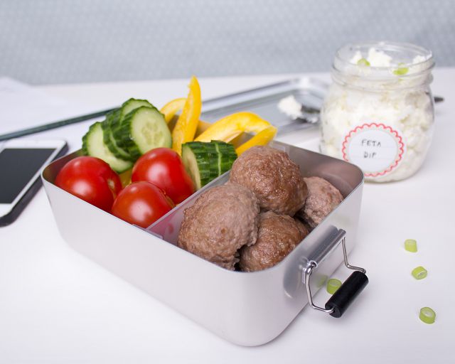 Fertig gepackte Lunchbox mit LCHF Hackbällchen