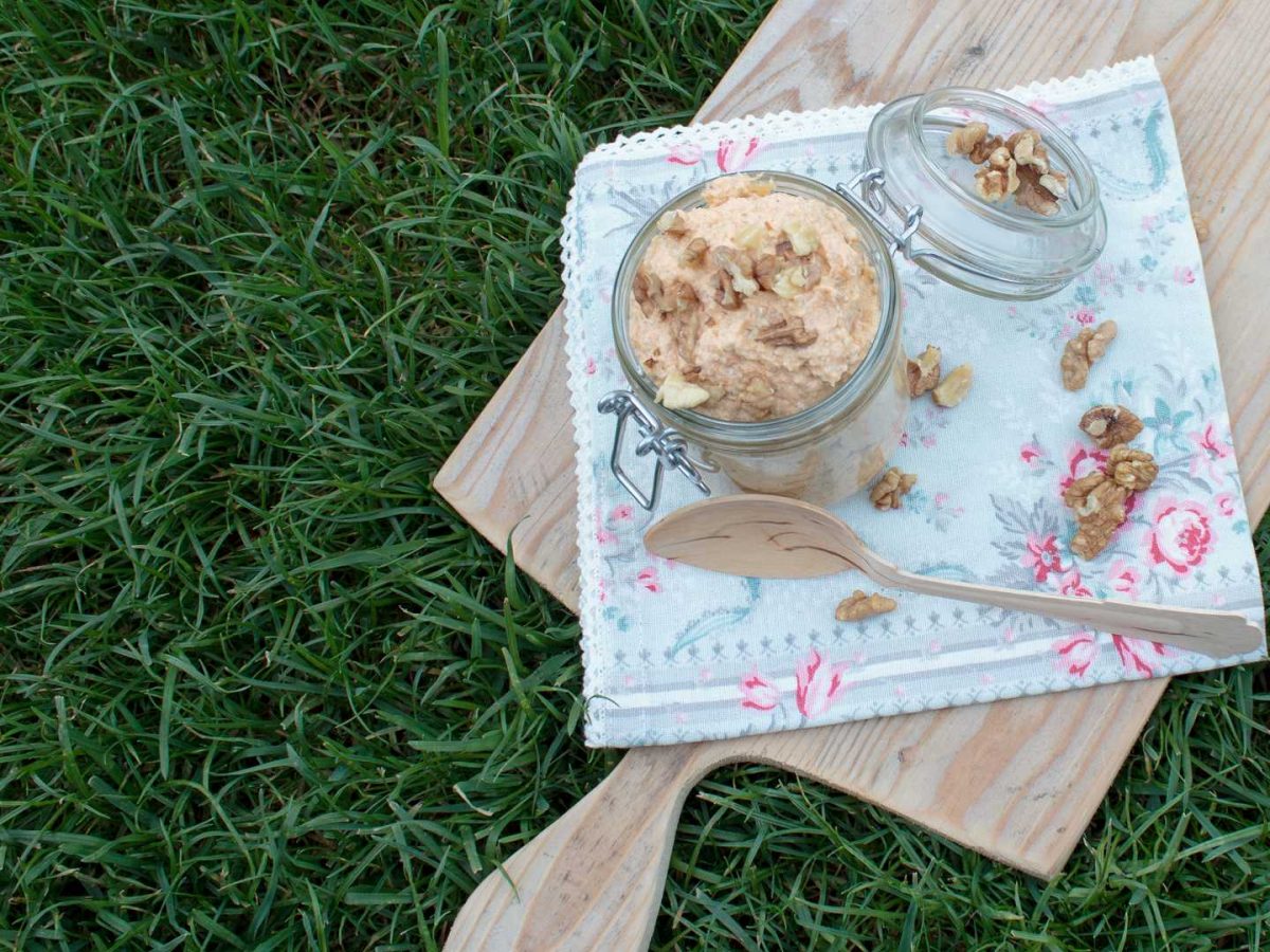 Damit kommen wir zum eigentlichen Dip. Er ist fettreich und dabei überraschend fruchtig, mit einer nussigen Note. Wir verwenden das Low Carb-Obst Papaya (mit 2,2 Gramm Kohlenhydrate/100 Gramm) und kombinieren mit Walnüssen. Eine echte Low Carb Köstlichkeit, die übrigens auch zu Spargel passt. Dazu kommt milder Hüttenkäse, gute Butter und ein paar Gewürze – fertig ist der Dip für eine Mahlzeit mit wenig Kohlenhydraten.
