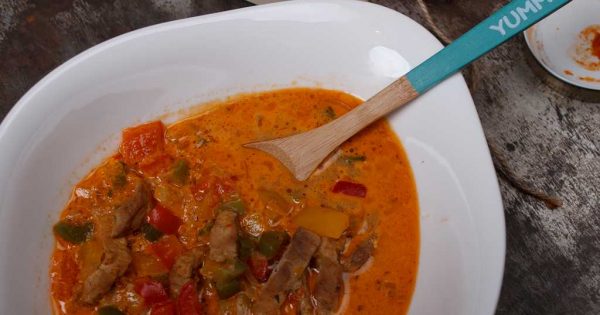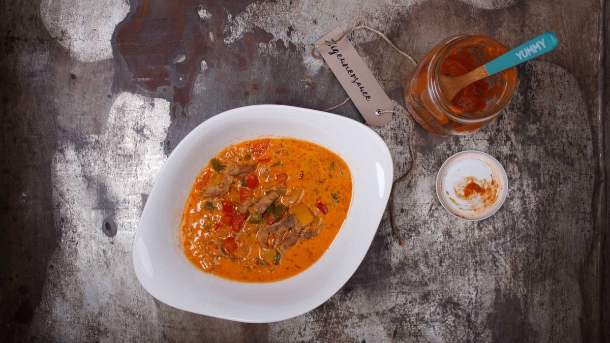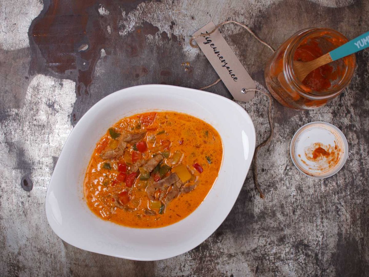 - In der Zwischenzeit Paprika waschen, putzen und ebenfalls in Würfel schneiden. Zusammen mit dem marinierten Fleisch und der Sahne in einen Suppentopf füllen. Brühe, Zigeunersauce und Zwiebeln zufügen und aufkochen lassen. Auf mittlerer Stufe 20 Minuten köcheln lassen. Mit Salz und Pfeffer abschmecken und servieren – guten Hunger!