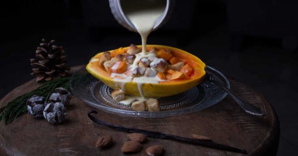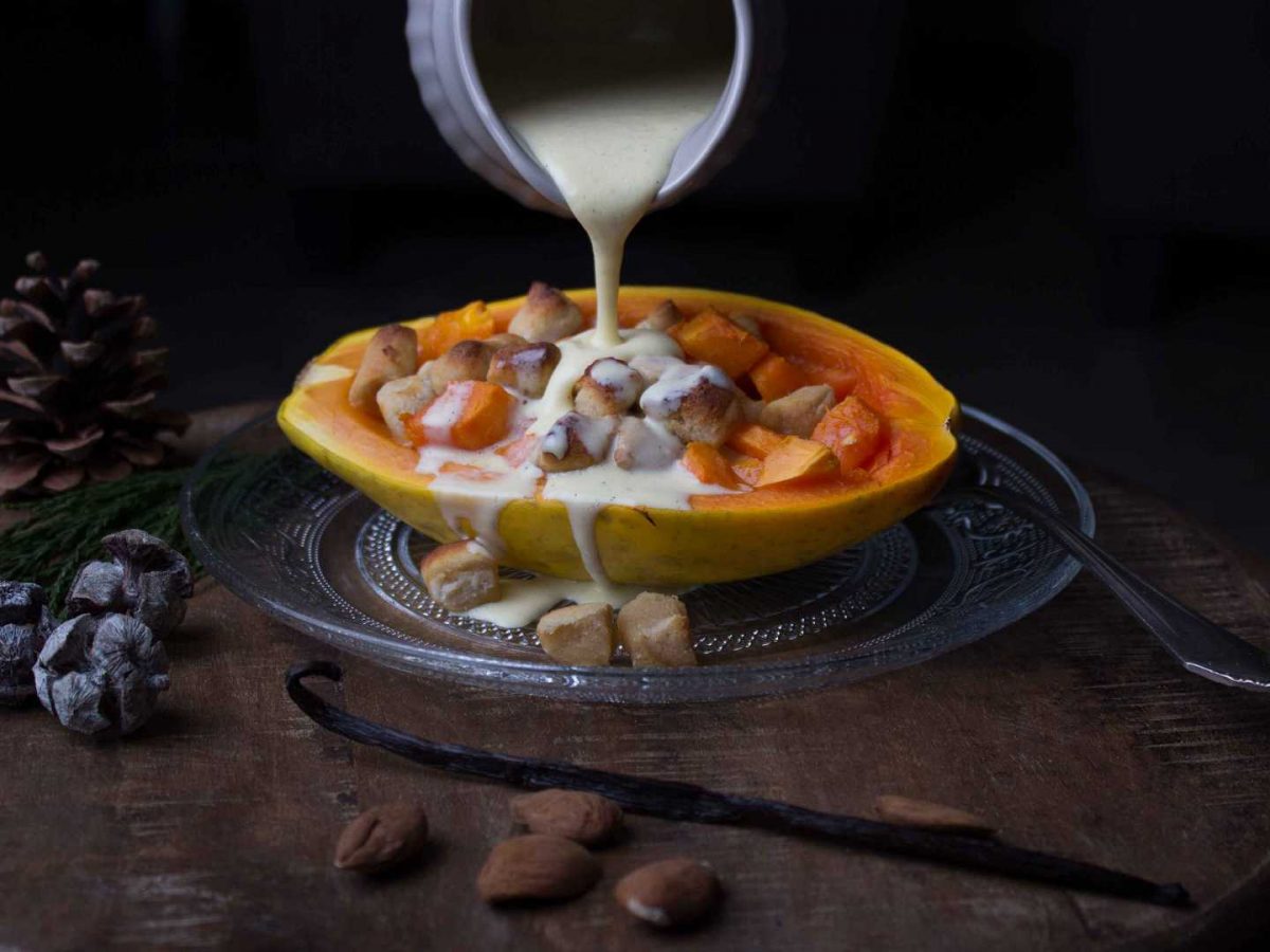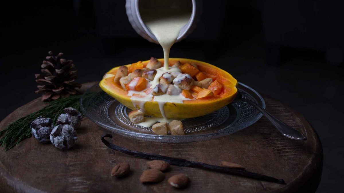 LCHF Dessert: Gebackene Papaya mit Marzipan und Vanillesoße
