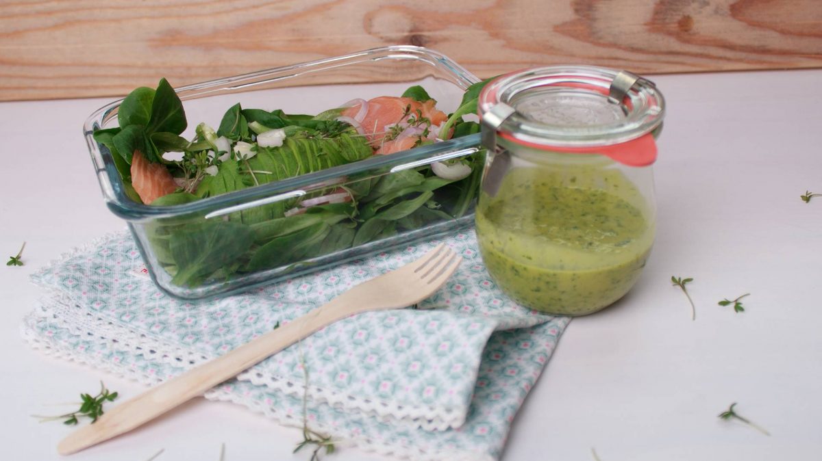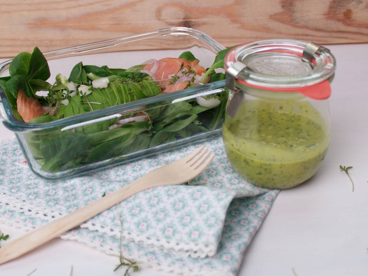 Räucherlachs und Avocado sind die Hauptdarsteller in der heutigen Lunchbox. Gemeinsam liefern sie dir wertvolle Fettsäuren, die dich fit halten für den Rest des Arbeitstages. Obwohl es ein grüner Salat ist, sättigt er durch das enthaltene Fett. Allerdings setzt die Sättigung über Fett erst später ein, etwa 30 Minuten nach der Nahrungsaufnahme. Um die Zeit bis dahin zu überbrücken, füllt der frische Salat den Magen. Der Blattsalat liefert also nicht nur wertvolle Nährstoffe, er macht uns indirekt auch satt.