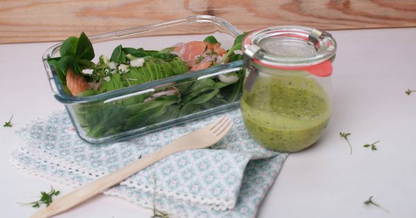 Du suchst nach einer frischen Idee für deine Mahlzeit unterwegs? Dann habe ich hier einen leckeren Salat mit Rucola-Senf-Dressing für dich. Der Salat ist in weniger als 15 Minuten vorbereitet. Falls du das Dressing schon fertig hast, geht es sogar noch schneller.
