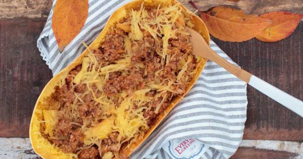 Für dieses Rezept wird der Kürbis im Ganzen im heißen Wasserbad gegart, nicht gekocht. Denn: Sobald das Wasser kocht, platzt die Schale. Während der Kürbis gart, kann die Bolognese vorbereitet werden (hier kommen statt Paprika und Tomaten Champignons zum Einsatz, was etwas Kohlenhydrate spart). Der Low Carb Spaghetti-Eintopf steht daher nach einer guten Stunde auf dem Tisch, davon warst du etwa 30 Minuten aktiv.