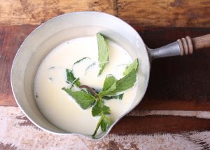 Zunächst kommen 500 ml Sahne, optional um 1 EL Honig ergänzt, in einen ausreichend großen Topf. Bevor die Sahne zum Kochen gebracht wird, werden 3-4 Stängel Minze unter kaltem Wasser abgespült, trocken geschüttelt und mit Küchengarn zusammengebunden.