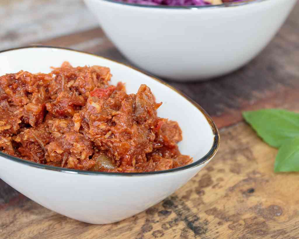 - Mit einer Gabel das Fleisch zerrupfen. Alternativ funktioniert das auch mit einer leistungsstarken Küchenmaschine. Dafür das Fleisch aus der Soße heben und kurz und kräftig schreddern. Anschließend mit der Soße vermengen.