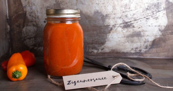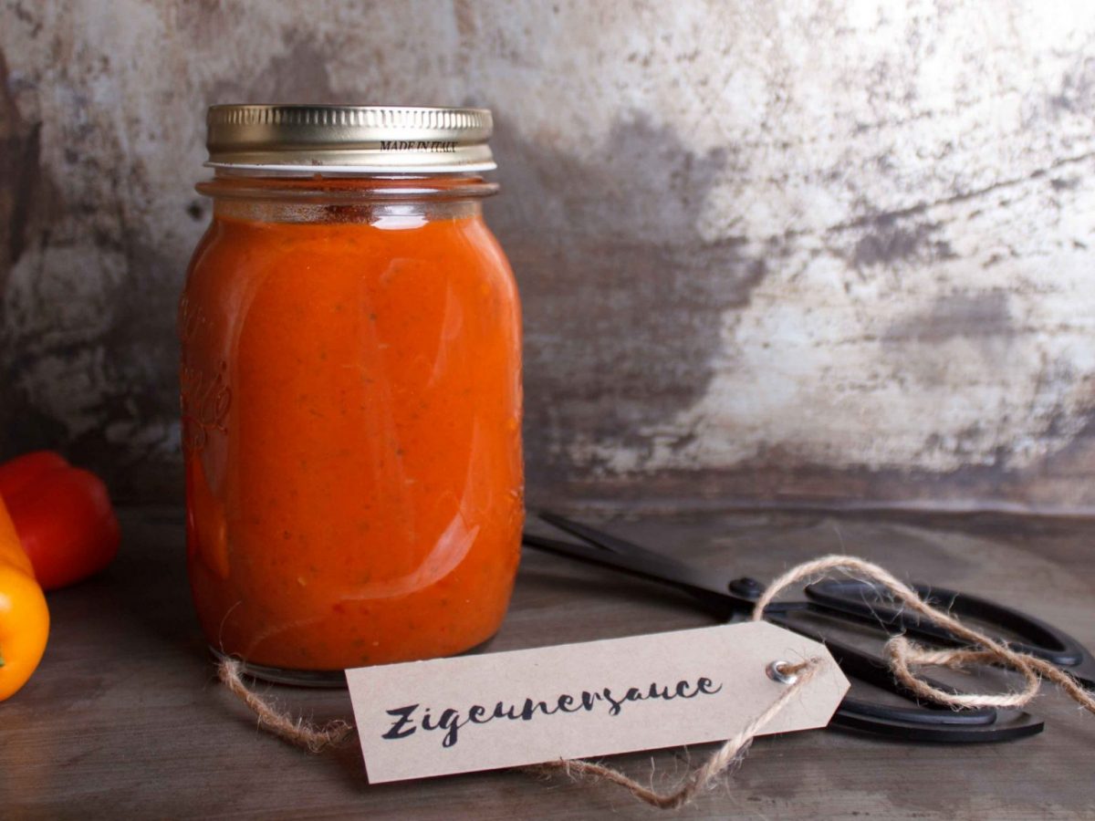 Bis zur weiteren Verwendung im Kühlschrank aufbewahren. Alternativ kannst du die Zigeunersoße durch Einkochen länger haltbar machen. Zum Einkochen heizt du den Backofen auf 100 Grad vor (ob Ober- und Unterhitze oder Heißluft ist egal). Stelle die Gläser nebeneinander auf die Fettpfanne, lasse aber Abstand zwischen den Gläsern. Fülle Wasser auf, bis es etwa 3 cm hoch in der Fettpfanne steht. Gib die Fettpfanne in den Backofen und lass die Sauce 1 Stunde einkochen. Nachdem sie abgekühlt ist, hält sie sich 6 Monate.