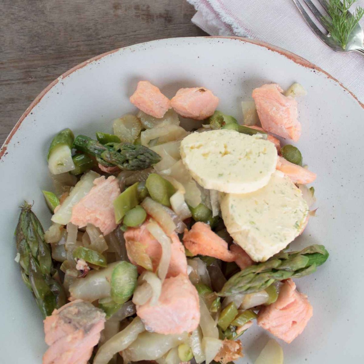 Zugegeben, manchmal ist der Alltag stressig und es kostet Mühe, nach einem anstrengenden Tag noch frisch zu kochen. Da kommen schnelle Low Carb-Rezepte gerade recht, oder? Hier kommt ein Rezept für eine schnelle Gemüse-Fisch-Pfanne. Spargel, Fenchel und Lachs sind die Hauptzutaten und ergeben mit einer feinen Zitronenbutter ein tolles Aroma! Du kannst die Zitronenbutter übrigens auch schon vorab zubereiten und im Kühlschrank bis zur Verwendung aufbewahren. Dann hast du deine kohlenhydratarme Mahlzeit in unter 30 Minuten auf dem Tisch!